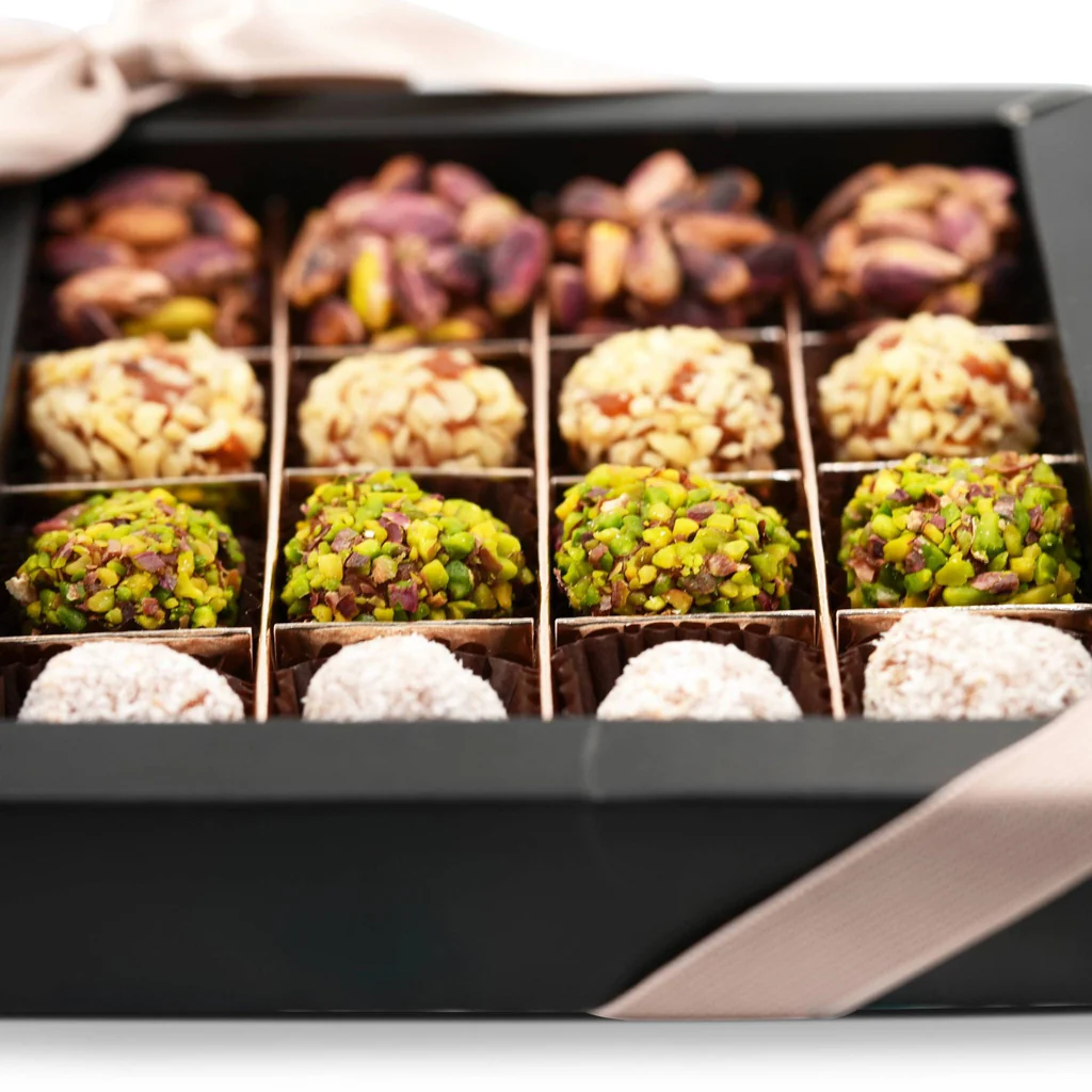 Each truffle in the gift box is a testament to artisanal craftsmanship. The harmonious blend of pistachios, hazelnuts, and coconut creates a symphony of flavors and textures that dance on the palate. The natural sweetness of the nuts, combined with the subtle richness of coconut, offers a multi-layered tasting experience that is both satisfying and intriguing.