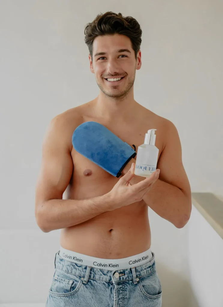 ✔ Exfolieer: Gebruik de ROQUEBRUN exfoliërende handschoen 24 uur voor het aanbrengen van je self-tanner. Vermijd olie-gebaseerde scrubs, aangezien deze een barrière op je huid kunnen vormen. Deze stap verwijdert dode huidcellen, zodat je een gladde, egale tan krijgt die langer blijft.