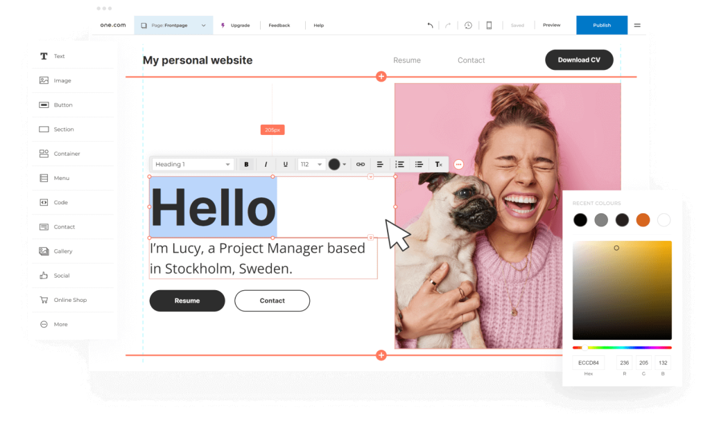 One.coms nettsidebygger er designet med enkelhet i fokus. Med dra-og-slipp-funksjonalitet kan brukerne enkelt plassere tekst, bilder, videoer og andre elementer på nettsiden sin uten behov for tekniske ferdigheter. Dette gjør det mulig å raskt sette opp en nettside som ser profesjonell ut, samtidig som man har full kontroll over utseende og innhold.